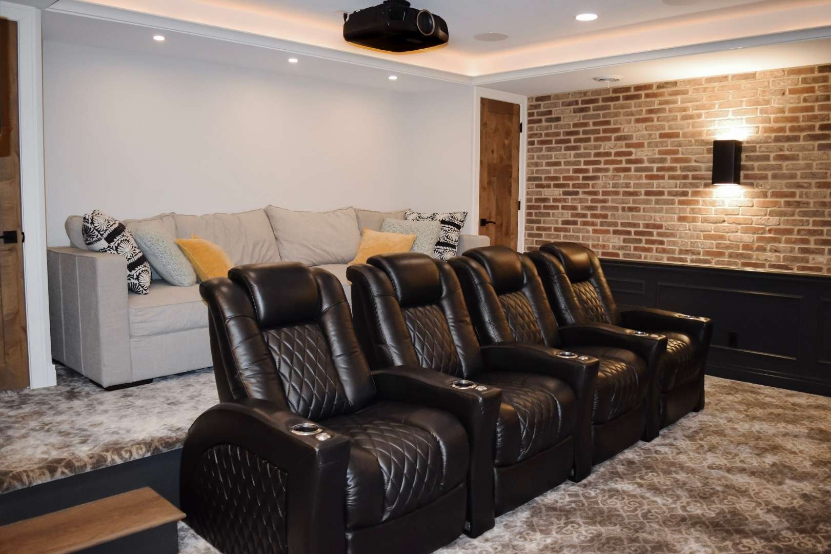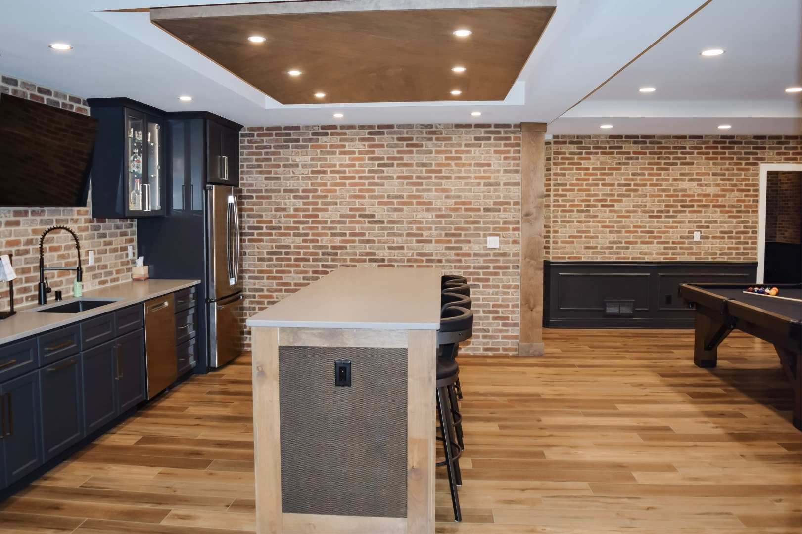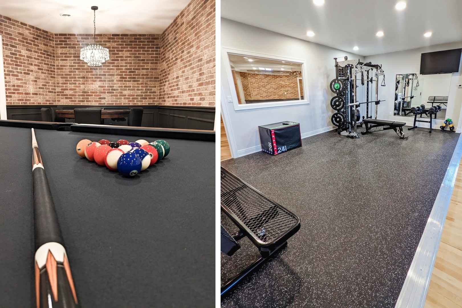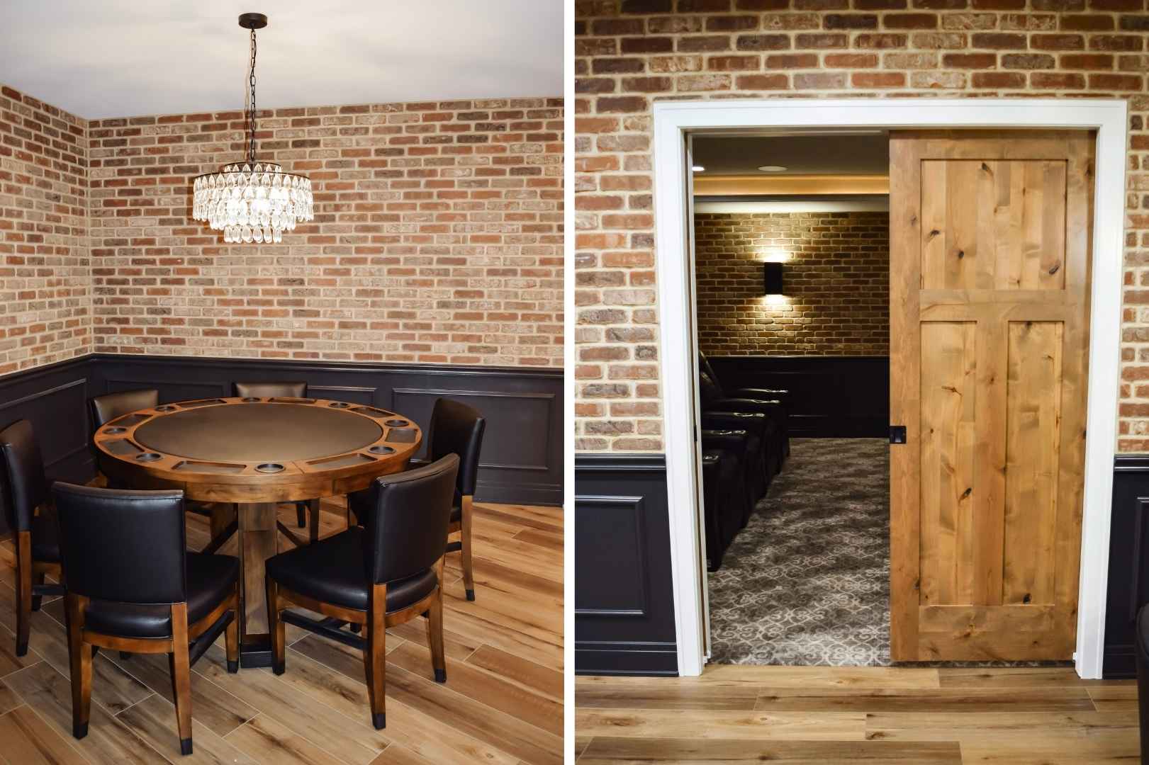 From a design standpoint, every detail was thoughtfully curated. Brick feature walls add warmth and character, while wainscoting, a tray ceiling, and statement light fixtures elevate the overall look and feel. The result is a cohesive, functional basement that balances fun, comfort, and style—proving that a basement can be so much more than just extra space.