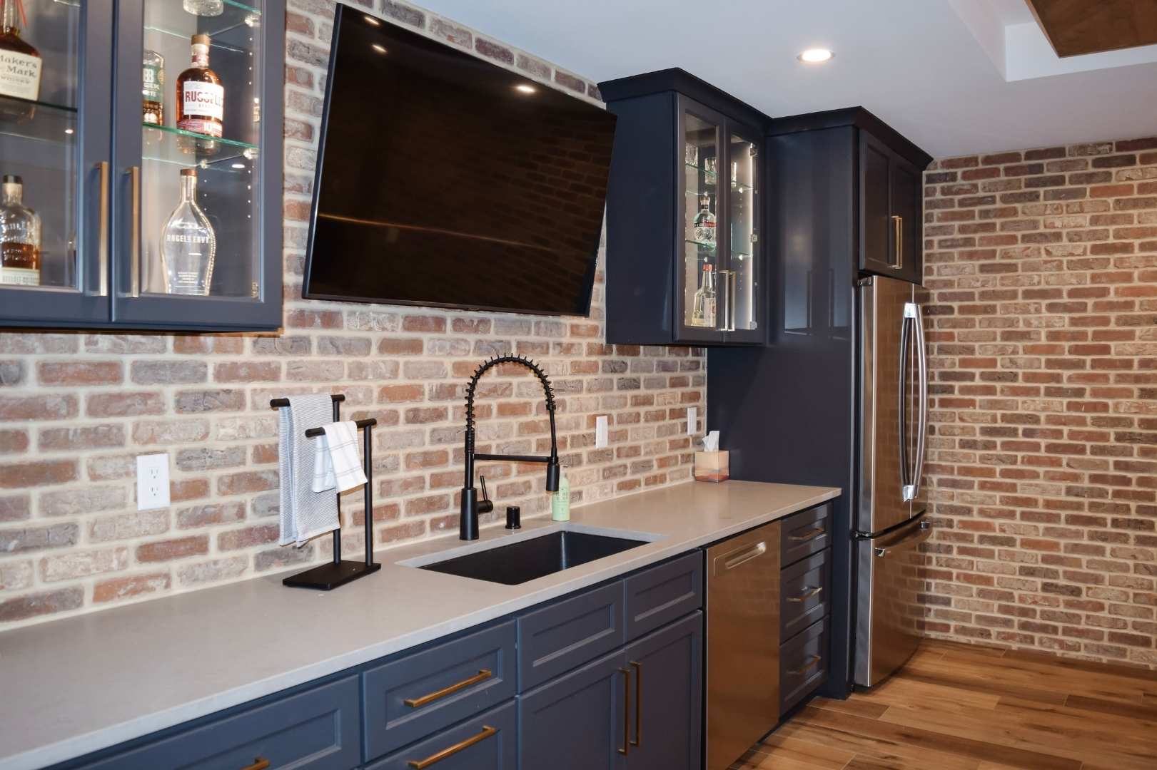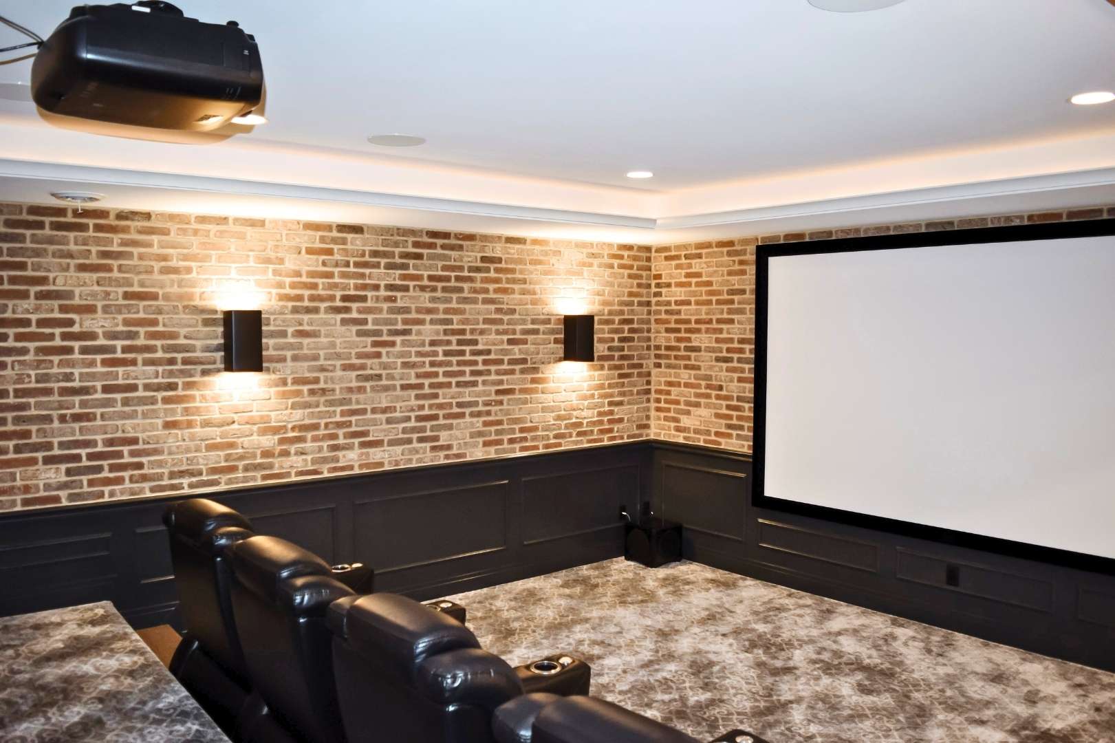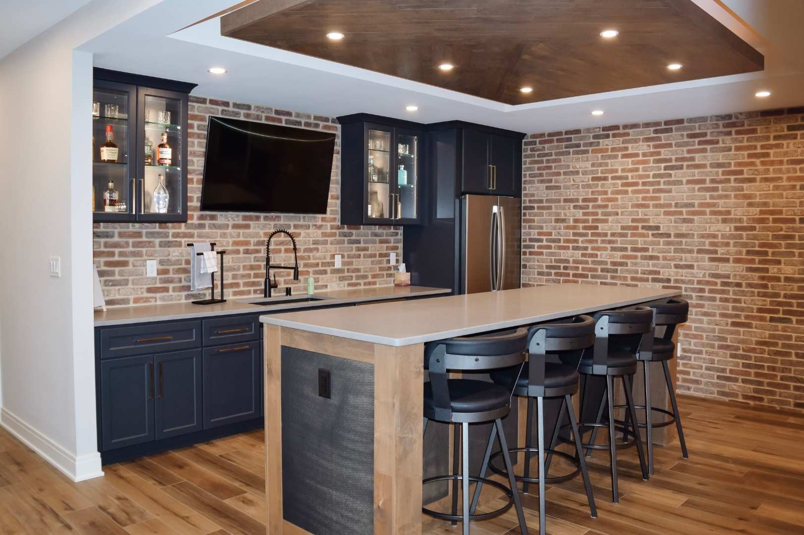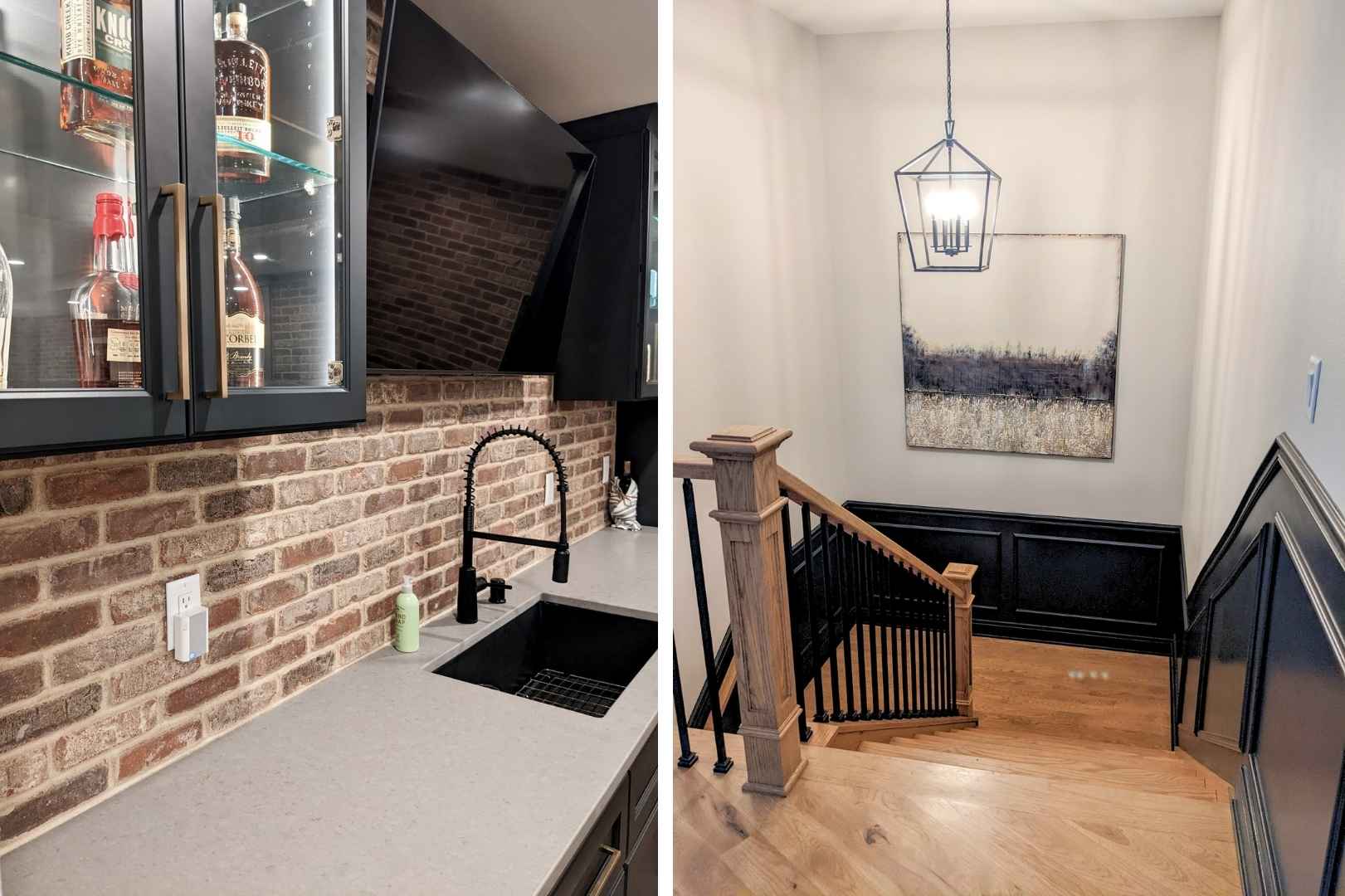 From a design standpoint, every detail was thoughtfully curated. Brick feature walls add warmth and character, while wainscoting, a tray ceiling, and statement light fixtures elevate the overall look and feel. The result is a cohesive, functional basement that balances fun, comfort, and style—proving that a basement can be so much more than just extra space.
