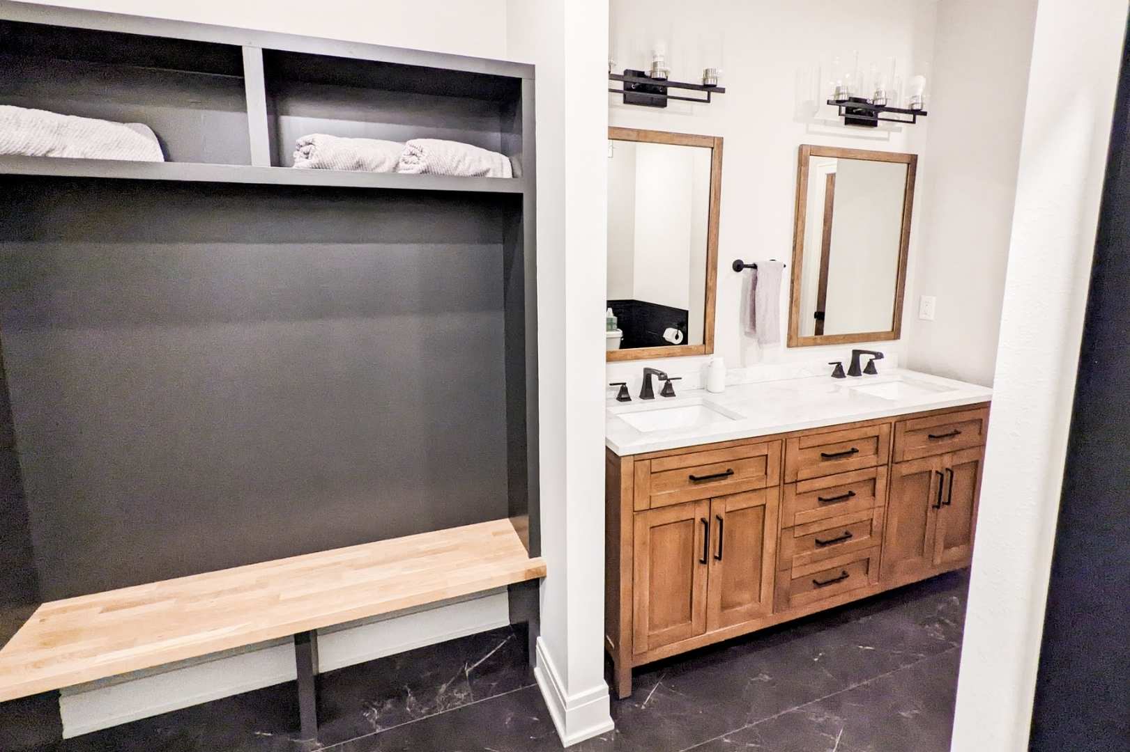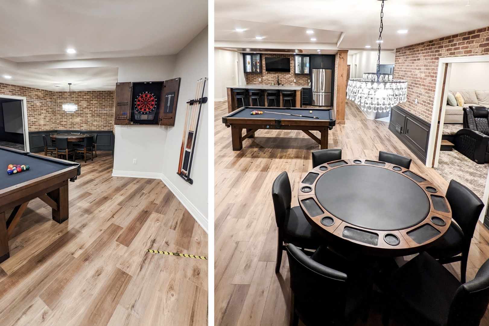 This basement renovation was designed to be the ultimate all-in-one hangout—perfect for entertaining, relaxing, and everyday family living. The space includes a custom full bar and rec room featuring darts, a pool table, and a card table, creating a natural hub for hosting friends and family.